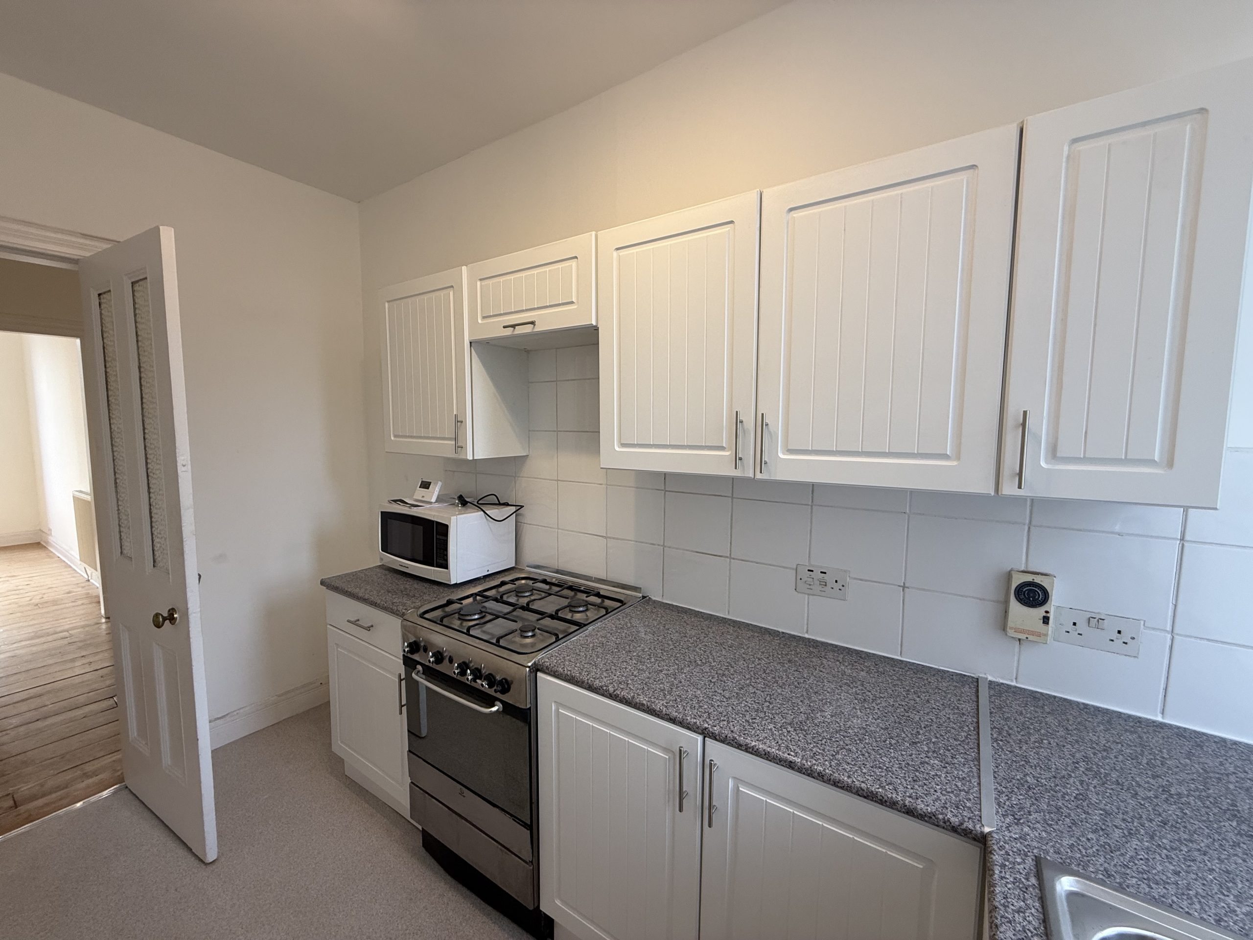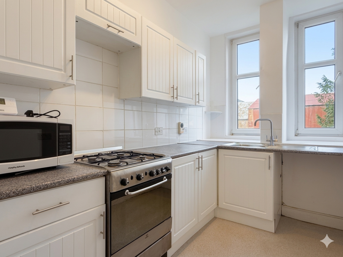 To the rear of the property, the kitchen is well fitted with modern grey wall and floor units, a four-burner gas hob, oven, and a large sink. Two windows overlook the communal garden, bringing in additional natural light.
