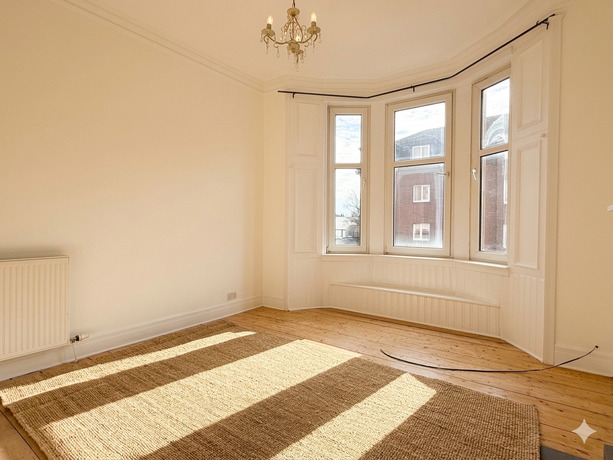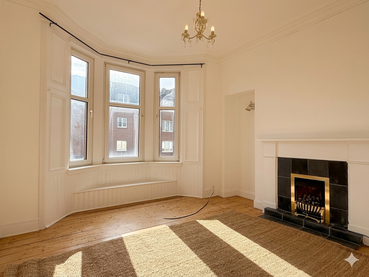 To the front of the flat is a spacious lounge featuring a large bay window that allows plenty of natural light to fill the room. A well-fitted fireplace provides an attractive focal point and adds to the warm, inviting atmosphere.