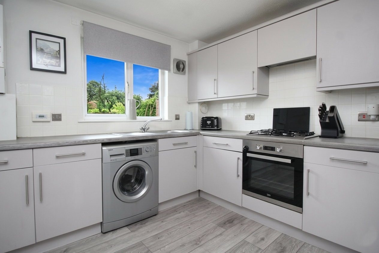 Breakfasting sized kitchen which has a range of modern floor and wall storage units with integrated hob and oven and and a built in sink and drainer. Plumbing for washing machine and space for fridge freezer with ample worktop surface area and a window to the front giving a nice open view.