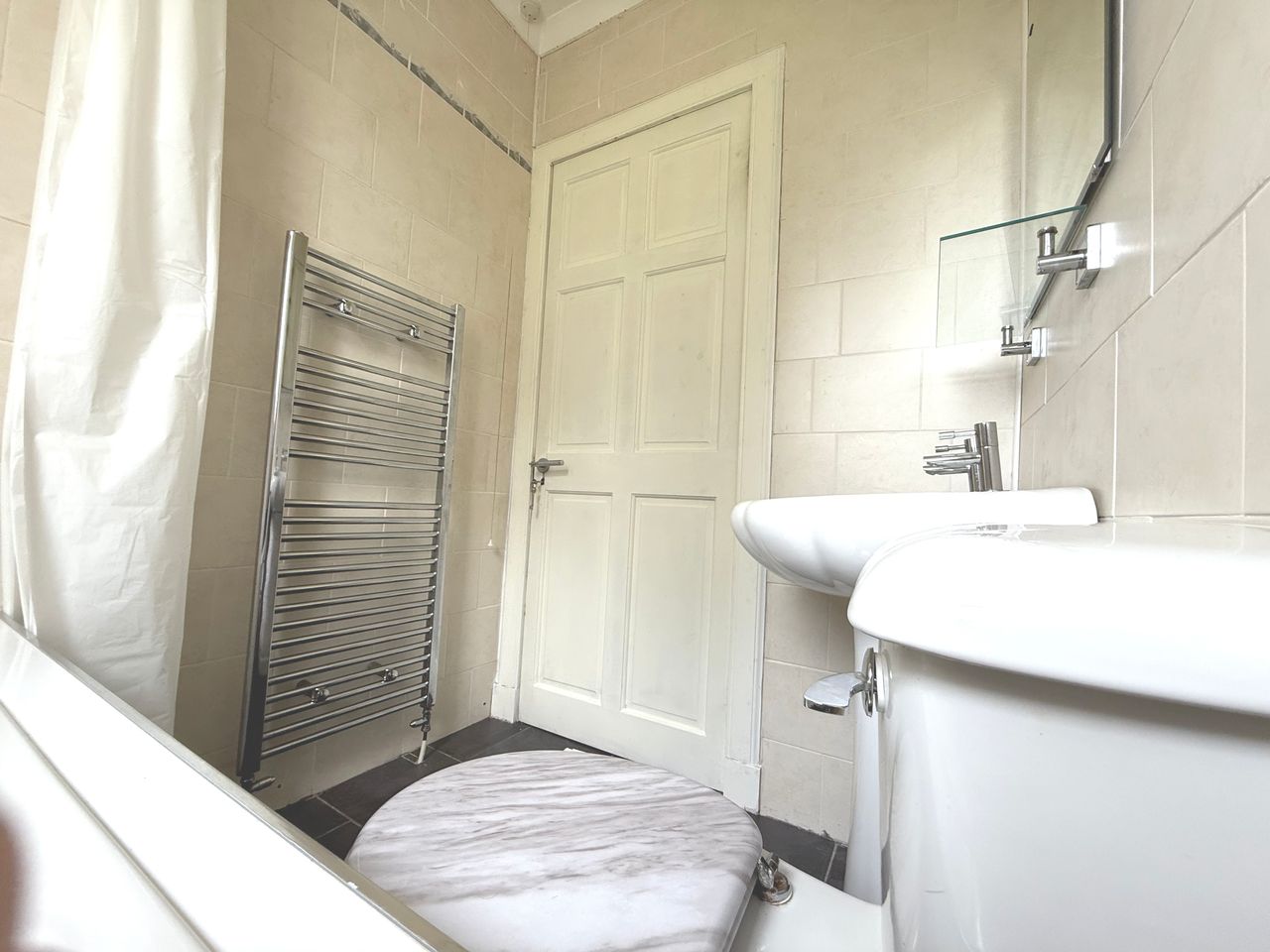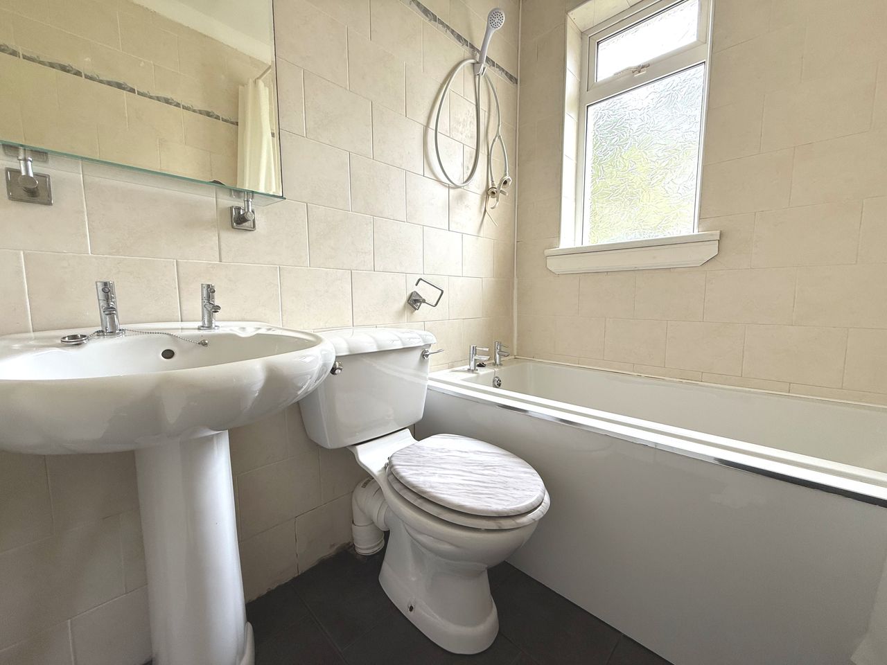The sleek three-piece bathroom suite comprises a full-sized bath, WC, and wash hand basin – all finished to a high standard.