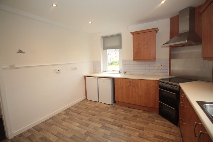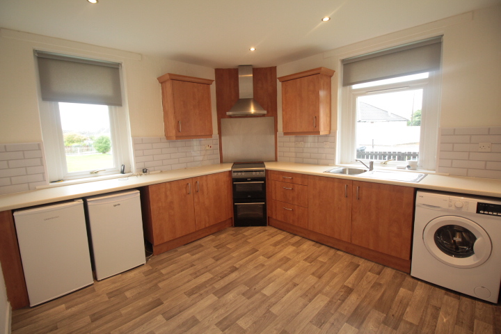 Large Fitted Kitchen with a range of wall and floor units completed with under counter fridge, under counter freezer, washing machine and oven hob and hood.