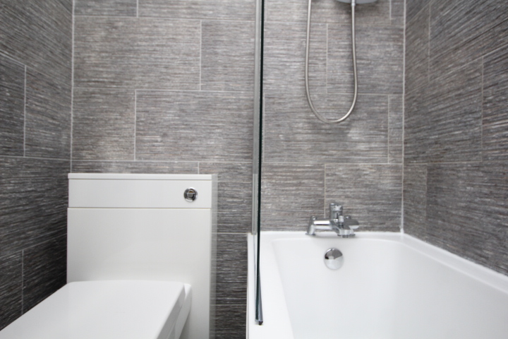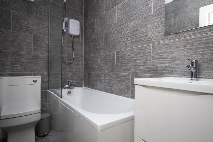 Impressive modern bathroom with lovely tiling and a white three piece suite comprising panelled bath with screen and a wall mounted electric shower, wash hand basin set within vanity unit and a close coupled w.c.
