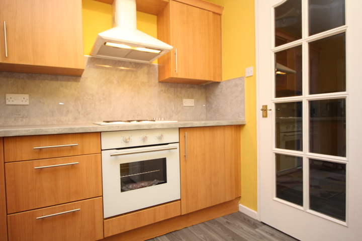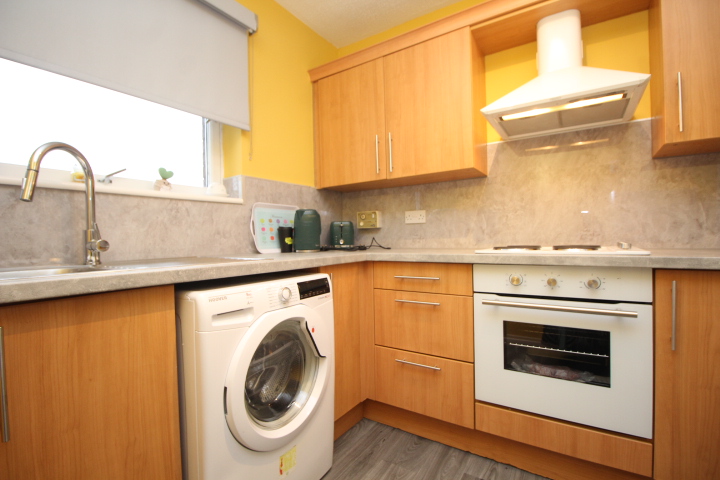 Modern kitchen with a range of floor and wall storage units and plenty worktop surface area with co co-ordinating splashback. Built in electric hob, oven and hood and a stainless sink and drainer with swan tap. Picture window to the rear which has a really nice elevated outlook over the area and at one side of the kitchen is a free standing fridge freezer which could also be a space for a breakfast table if required.