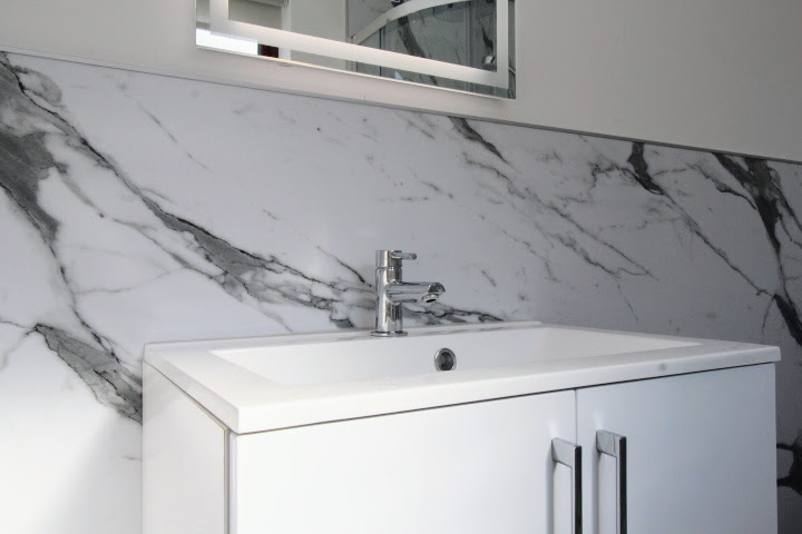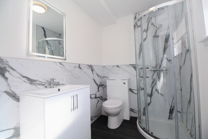 The en suite is equipped with an LED mirror and a sleek white three-piece suite, comprising a shower, wash hand basin, and W.C. The lower half of the room is finished in a marble effect.