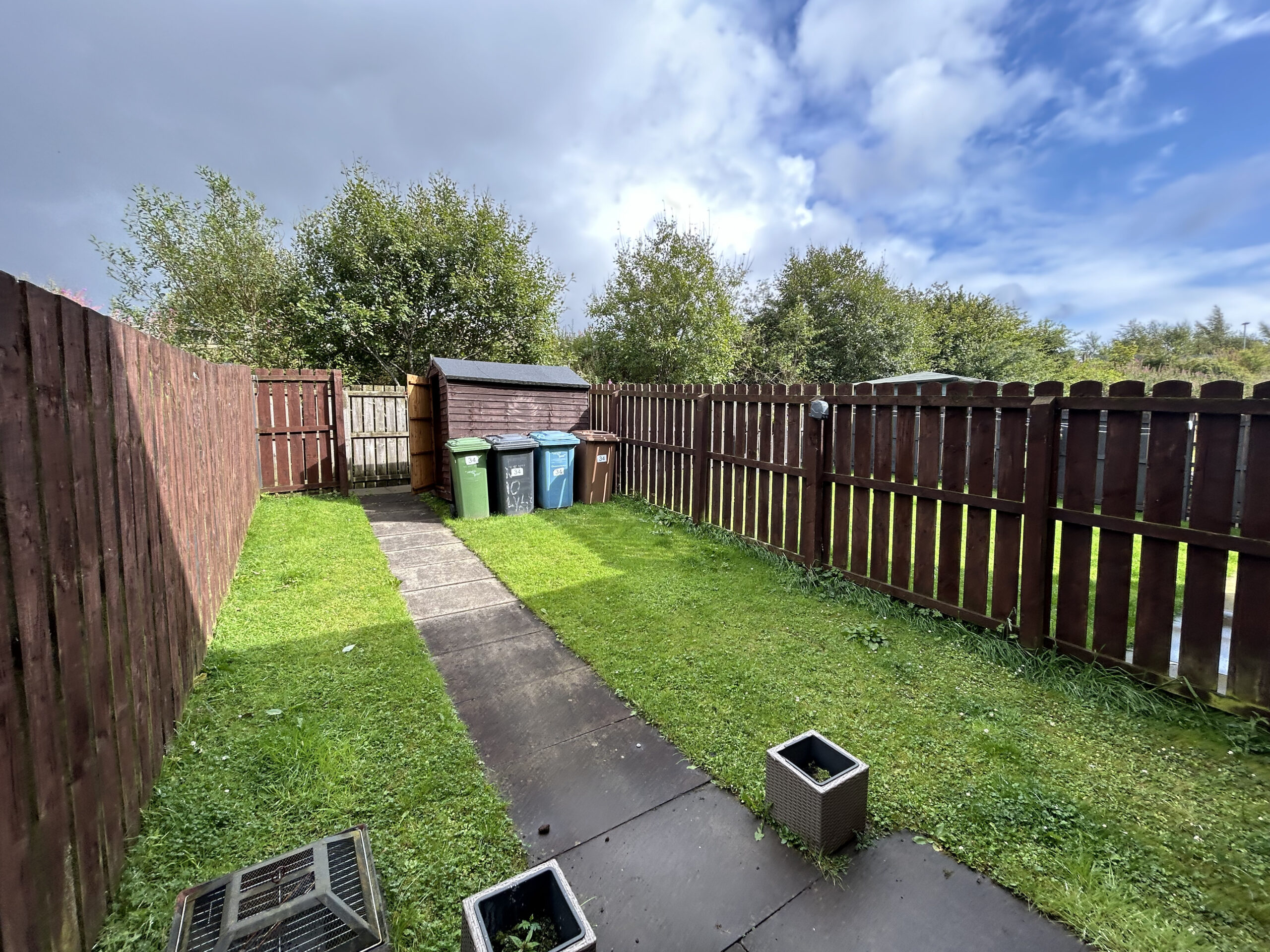 The rear garden is accessed through the Patio Doors within the kitchen with a small patio area garden shed and a grassed area.