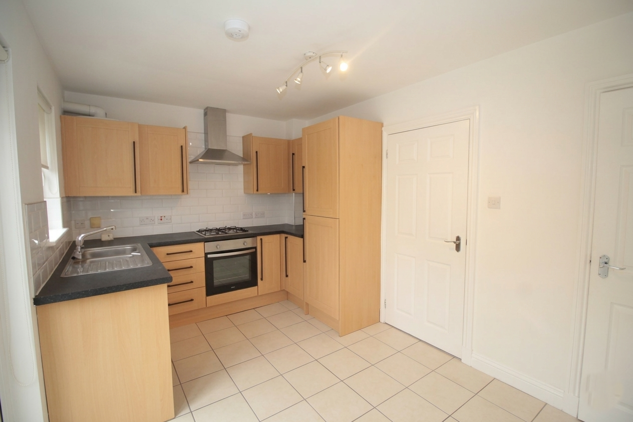 Rear Facing Modern Dining Kitchen with Integrated Fridge and Freezer, Oven Hob and Hood and Patio door providing great natural lighting and access to the rear garden. Completed with a Large Storage Cupboard, Tiled Flooring and Freshly Decorated Walls.