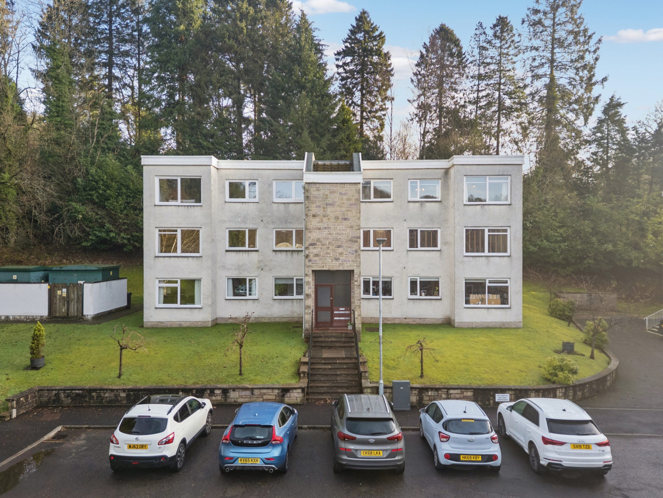 The building has a render exterior and is accessed via security controlled front door with stairs leading to all levels. At the front there are pavements and well tended lawned areas and adjacent to this is an area leading to the garages with this apartment having the garage furthest on the right and is the one which is accessed via new garage door.
