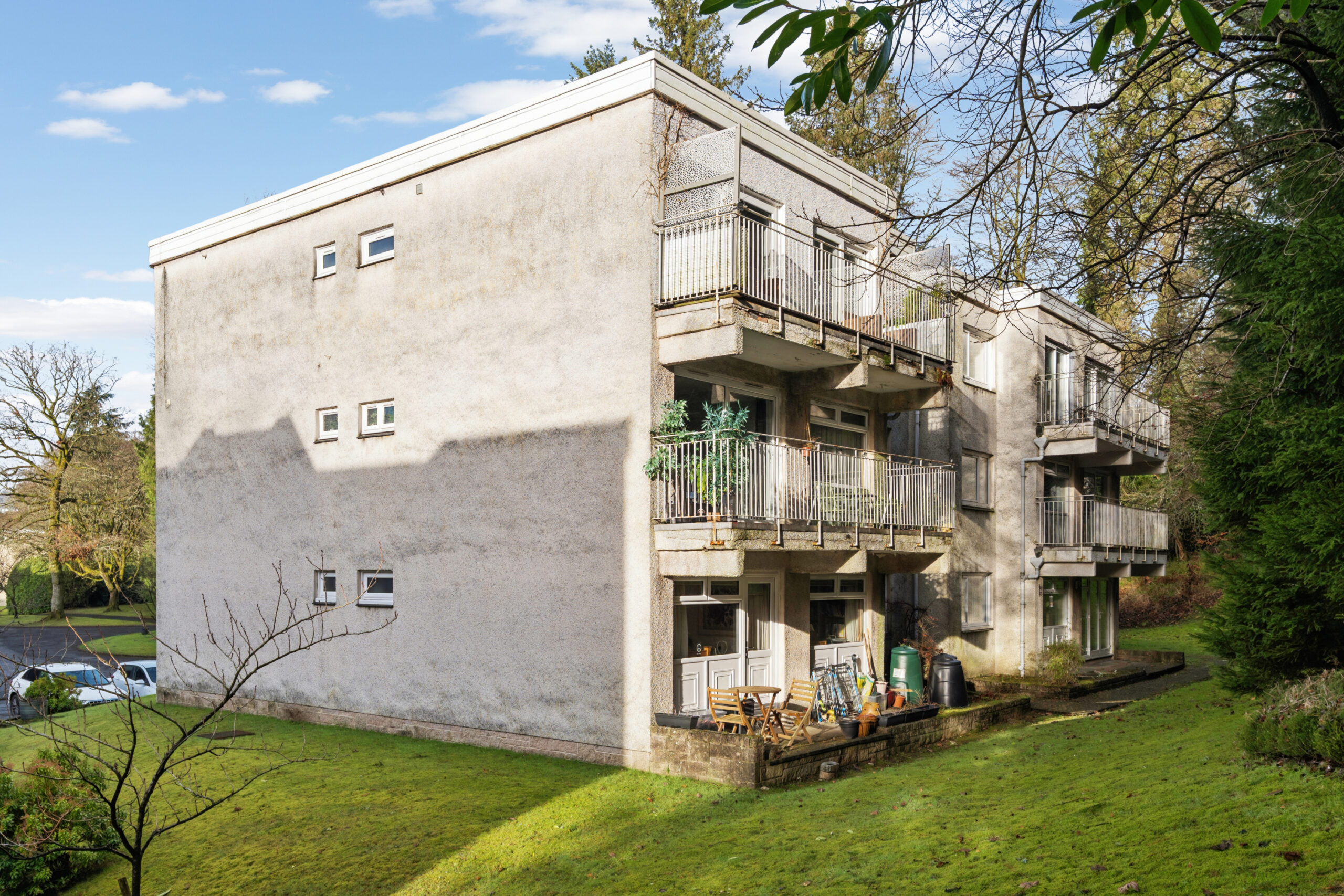 Netherblane has some beautiful communal areas including large lawns, mature trees and the development is noted for its delightful setting amidst extensive residents’ gardens that include the Blane Burn running into, and out of, its own private lochan – a delightful spot around which is a lovely wooded walk, with seating.