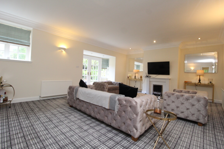 The ground floor comprises entrance hallway, open plan lounge/living room which is where the original lodge house was and comprises a 32 ft lounge area with focal point fireplace, raised dining area to the far side and french doors opening to the front garden. Separate dining/breakfasting room with doors opening to the rear decked garden and adjacent to this room is a lovely fitted kitchen with separate utility room. Completing the ground floor is a fabulous Sony Home Cinema Room, office/study/ bedroom three and separate wc.